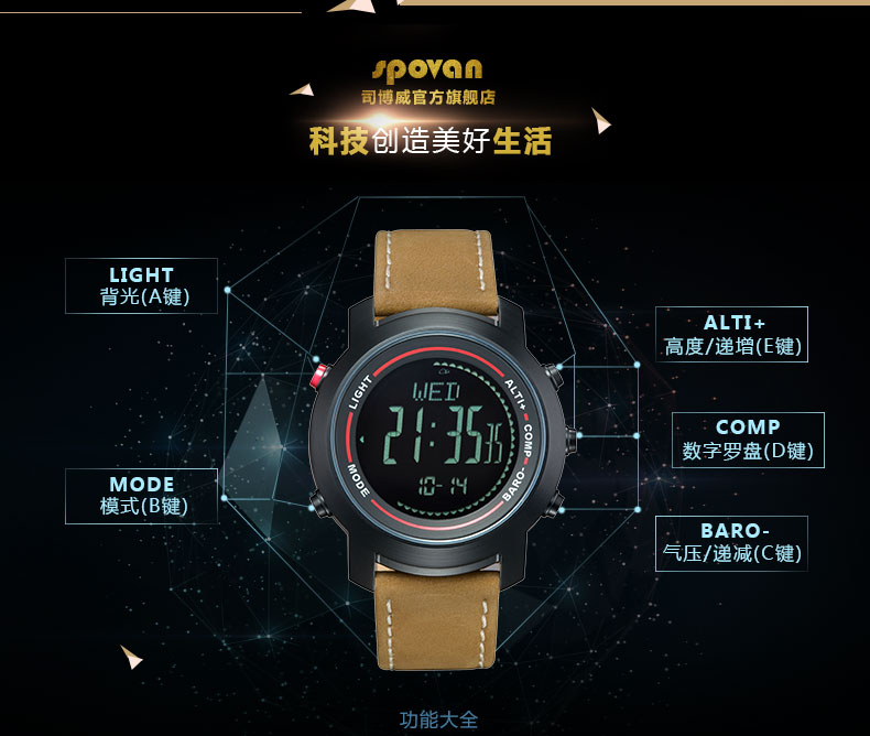 ▼spovan司博威多功能指南针户外运动手表MG01产品详情: