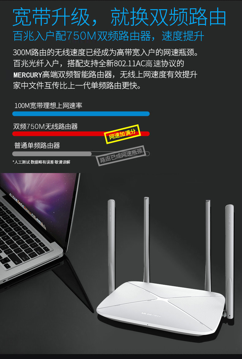 新品:水星双频5G无线路由器MAC750R家用tp穿墙王高速wifi光钎智能宽带MAC750R