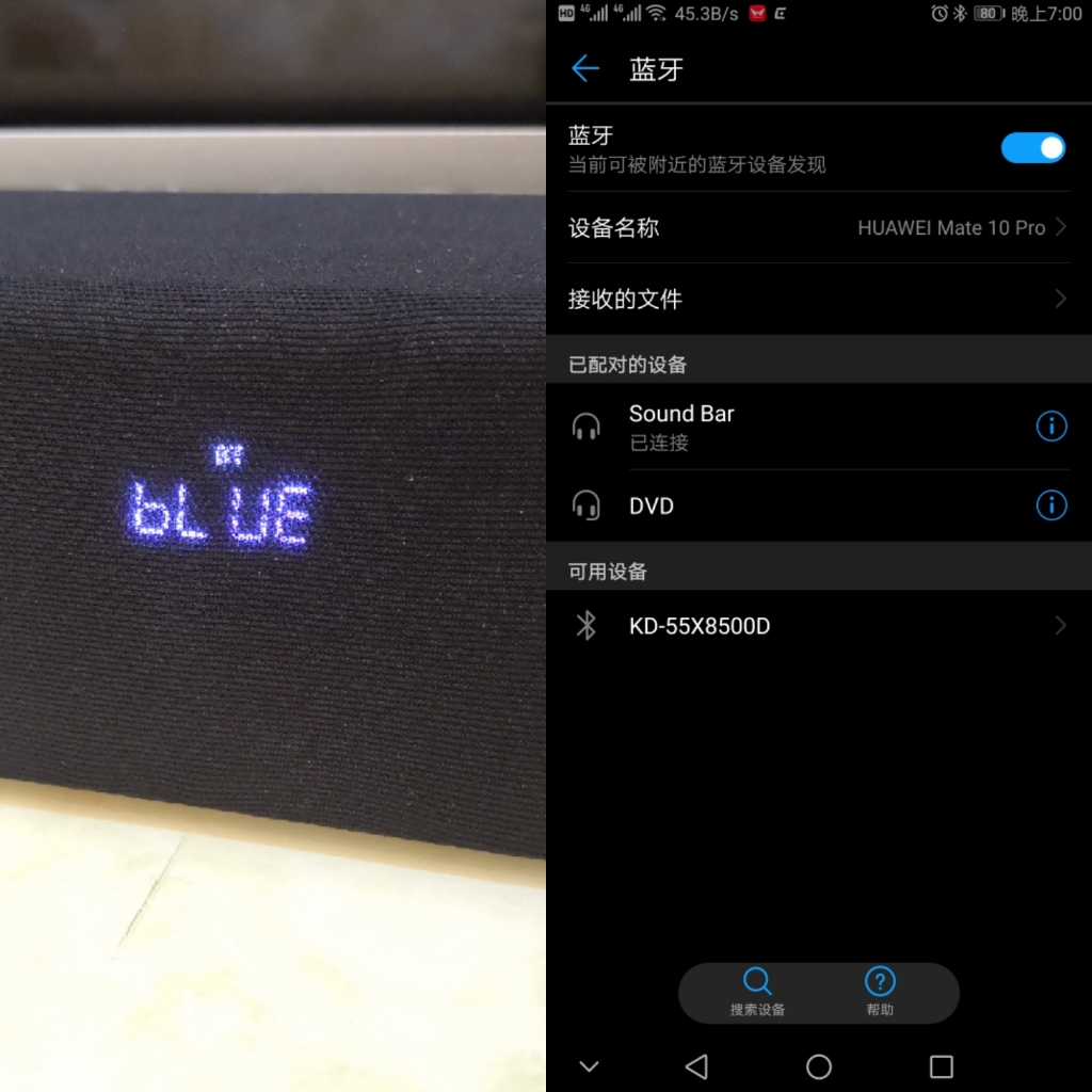 音响切换到现代消费者最喜用的蓝牙模式,然后在手机蓝牙搜索到“Sound Bar”点击即可连上使用。由于没有连接密码,建议用户不用的时候及时关闭音响,避免有淘气邻居“捣乱”。至于音效方面,由于手机端发不出录音,在此作文字评论吧。音量比电视内置的提升不大,但在本人的130平方房子使用卓卓有余了,日常音量开至12左右已经怕往上会遭邻居投诉。音质上提升比起电视本身不明显,但是低音炮和丰富的发声单元支持下,歌曲临场感有质的飞越。5.1声道的电影里,其环绕音表现并不明显,和电影院那种可以清晰分辨声音方向的音响虽然无法比,但是切换2.1和5.1音频对比还是可以明显感受到声音立体感的呈现。至于附带麦克风的声音,在测试中人声音量严重偏小,待本试客找到原因后为大家补充吧。